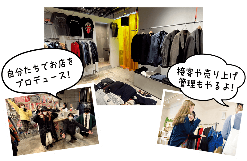 自分たちで考えたブランドの企画プレゼンを行い、買い付けをしたアイテムでショップをオープン!どんな商品を扱い、どう売っていくのか。本物のショップ経営を行い実践力を身につけます。