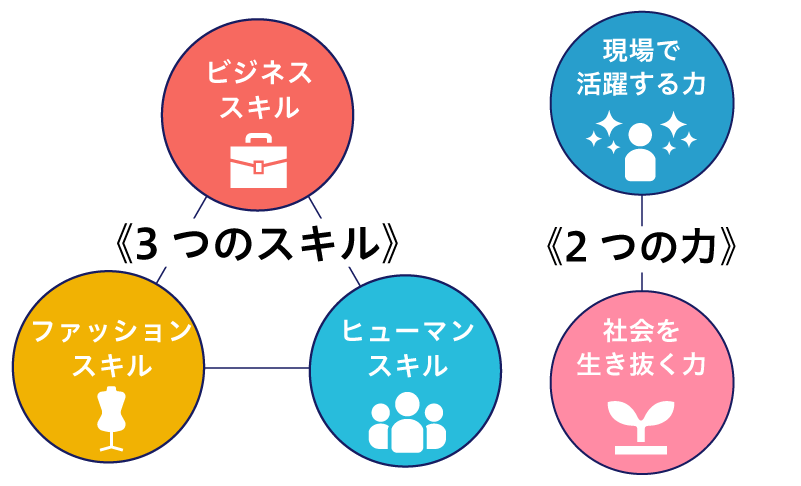 トレンドを掴む感性と企画力、新規ブランド企画や方向性の決定、販売する商品の構成など、あらゆる方向・ポジションで求められる知識やスキルを習得するたビジアカでは5つのテーマに特化して学びます。