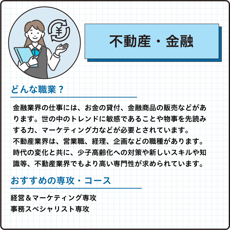 汎用性の高いビジネス能力を身につけておけば、幅広い業界での活躍ができます。不動産業界や食品業界など自分に合った業界を選ぶことができます。