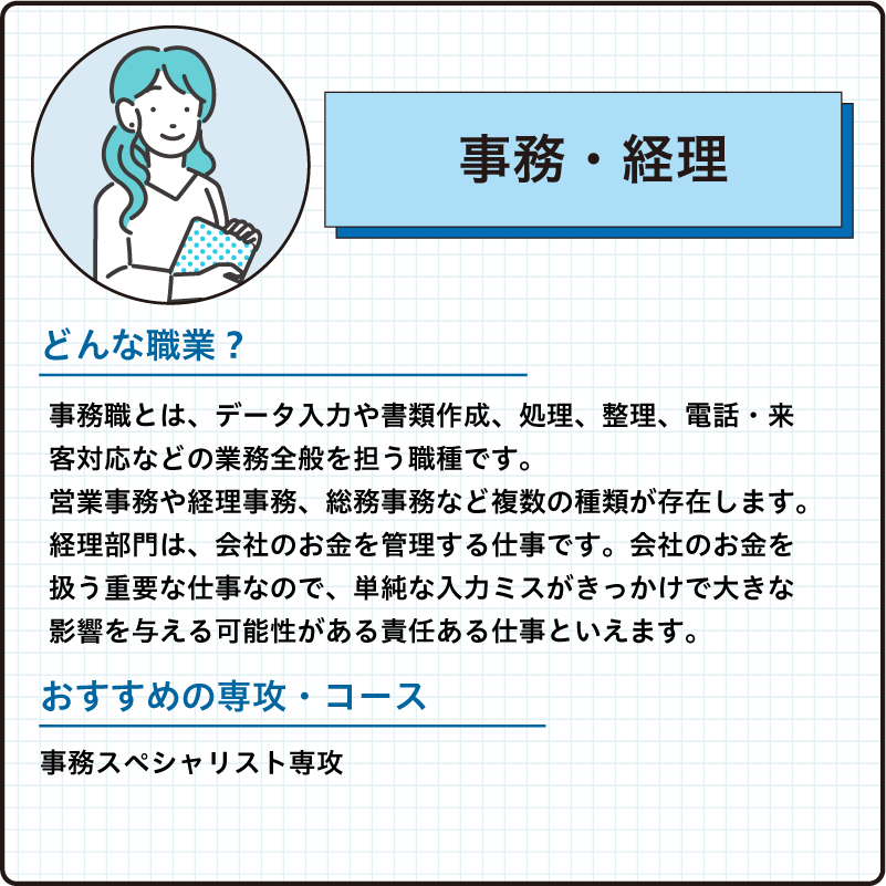 大阪ビジネス・アカデミーの総合ビジネス学科は、独立・起業などを目指す経営&マーケティング専攻、事務スタッフを目指す事務スペシャリスト専攻、留学生が対象のにほんびじねす専攻を設置しており、